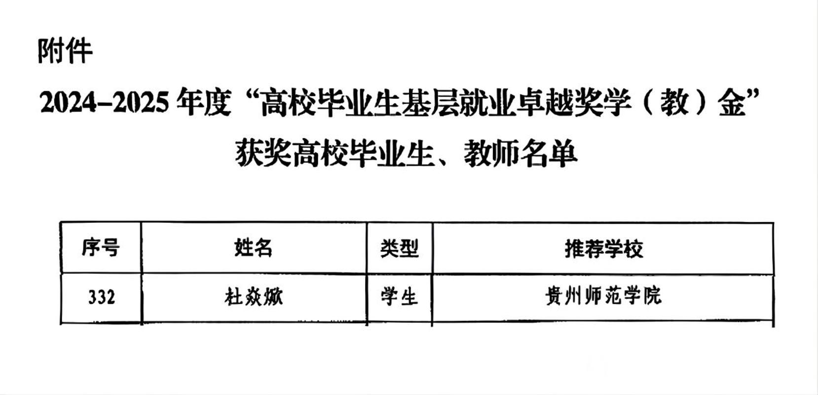 喜报 | 我校2017届毕业生杜焱焮荣获全国 “高校毕业生基层就业卓越奖学(教)金”